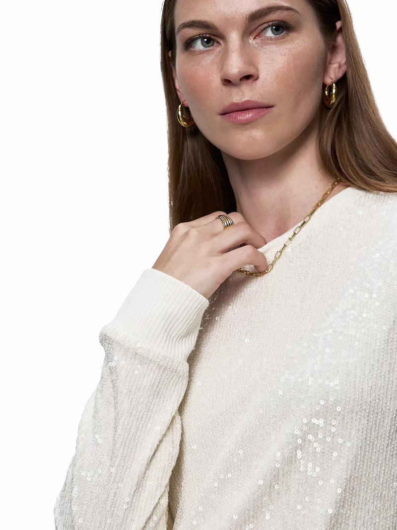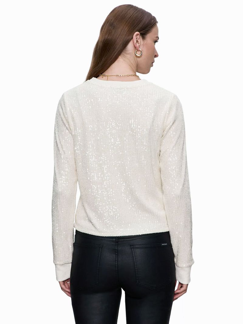 Make your days feel a little more fabulous with this chalk-white sparkled sequin top. It's fitted style and long ribbed edge sleeves make it a flattering fit and easy to layer while its scattered glow makes every outfit a little more fun.