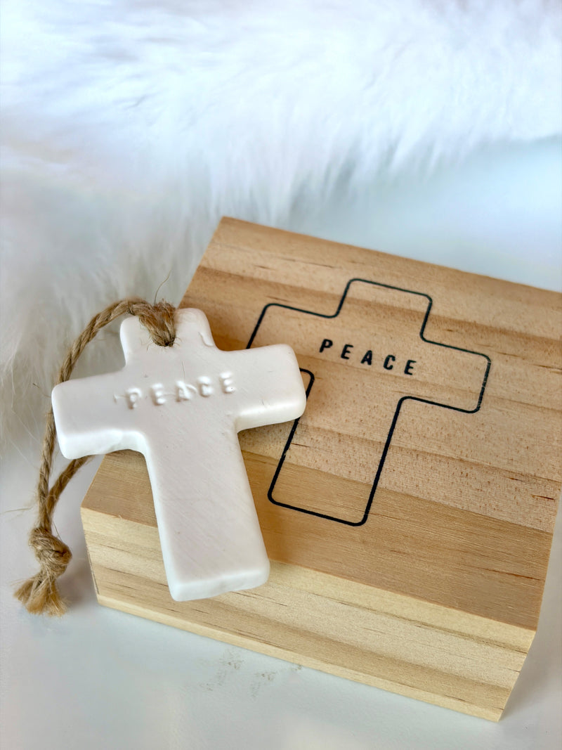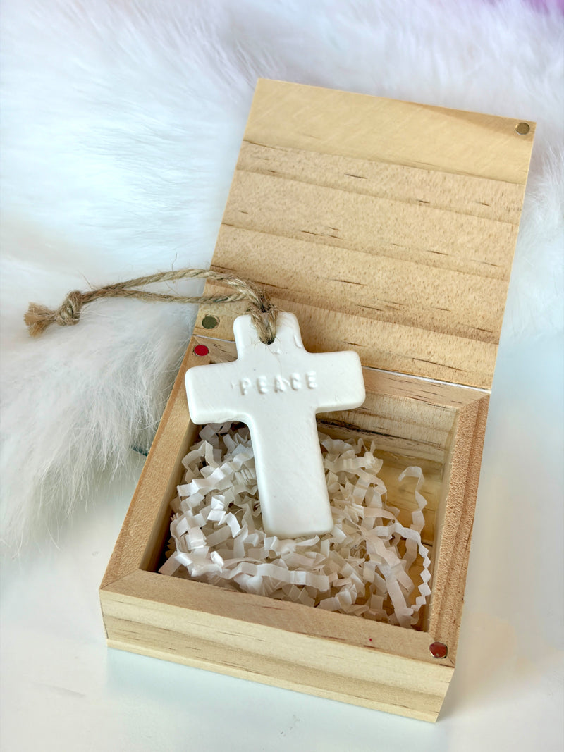 Hold a moment of calm in your hands with this beautifully crafted wooden peace gift box. Inside rests a delicate white ceramic cross, gently etched with the word “peace,”. Give the gift of a quiet reminder of comfort, faith, and serenity.