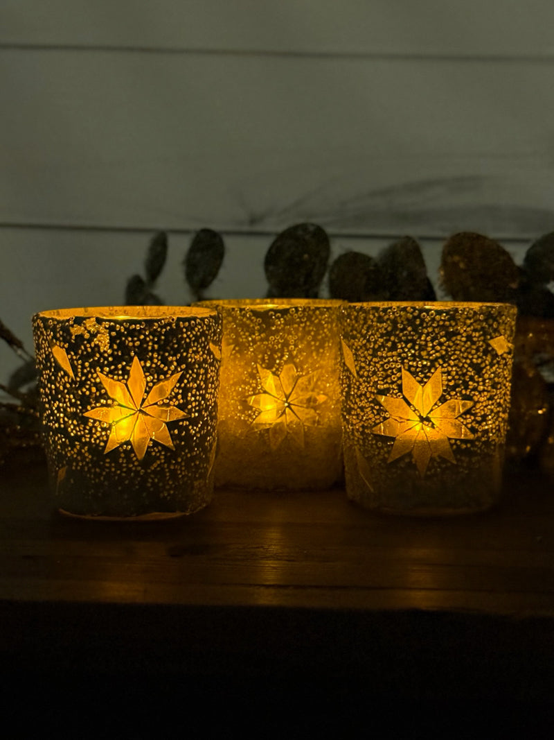 Add a touch of winter magic to your holiday décor with this enchanting mosaic glass candle holder. Its soft white exterior gently frosts the surface like freshly fallen snow, while light green glass undertones peek through snowflakes—creating a serene, evergreen-inspired glow when a candle is lit.