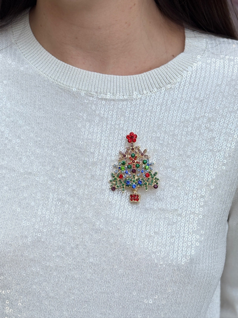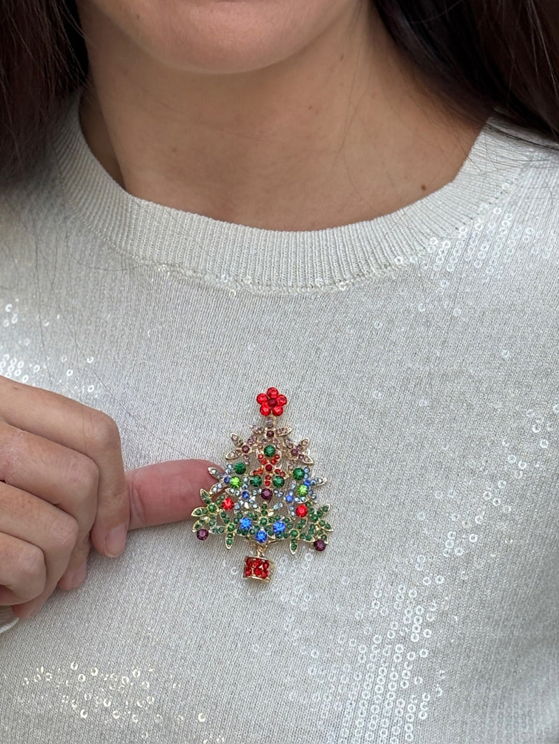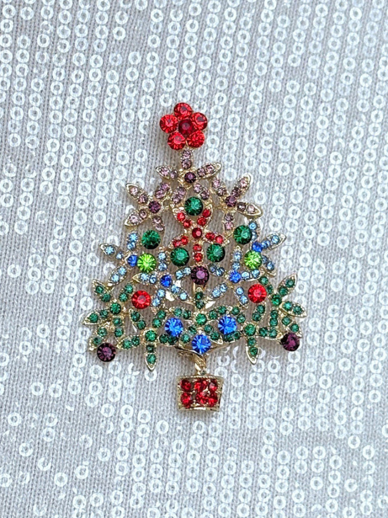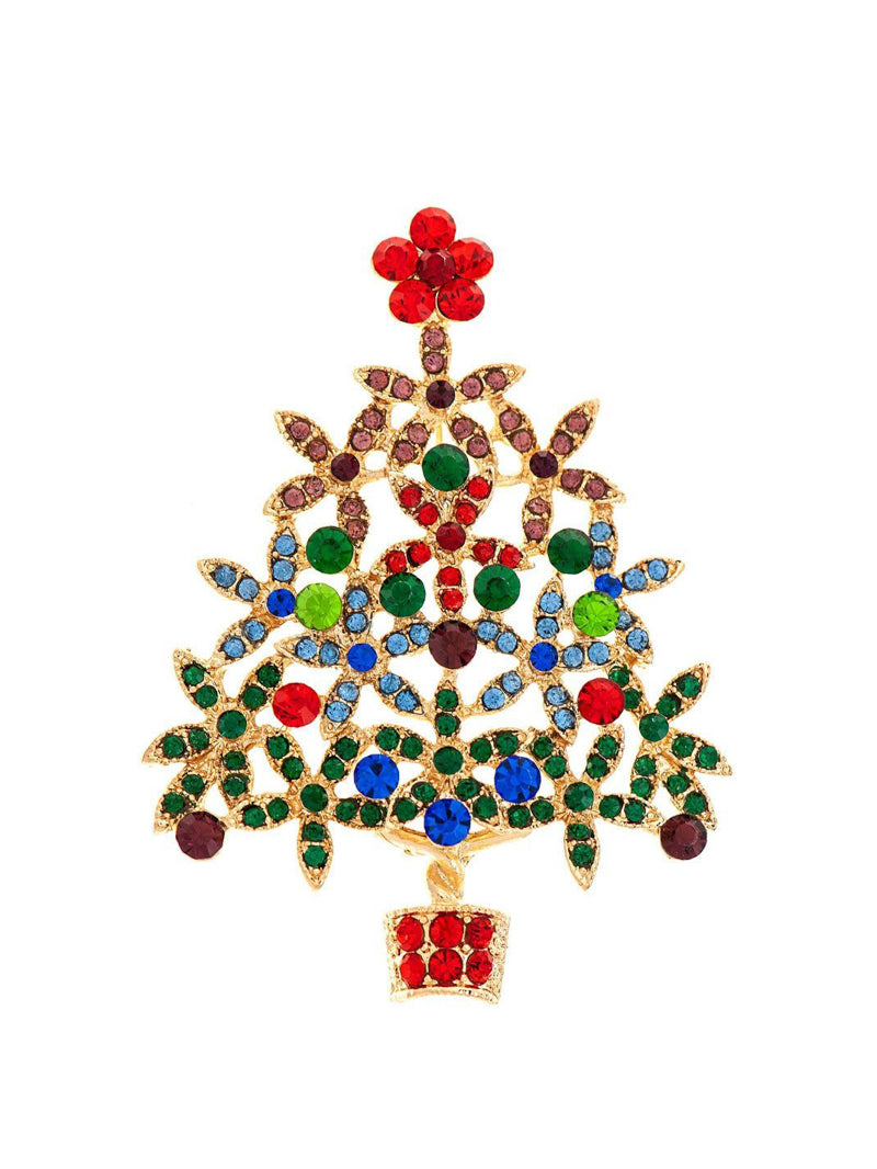 Add festive sparkle to any outfit with this vibrant gold multicolored crystal Christmas tree pin. Brilliant, colorful crystals shimmer like holiday lights, making this piece a charming and elegant touch for the season.