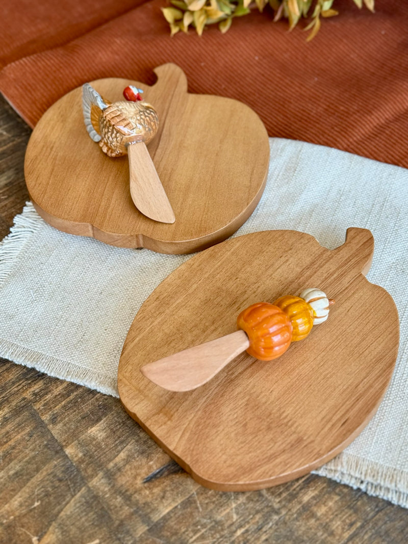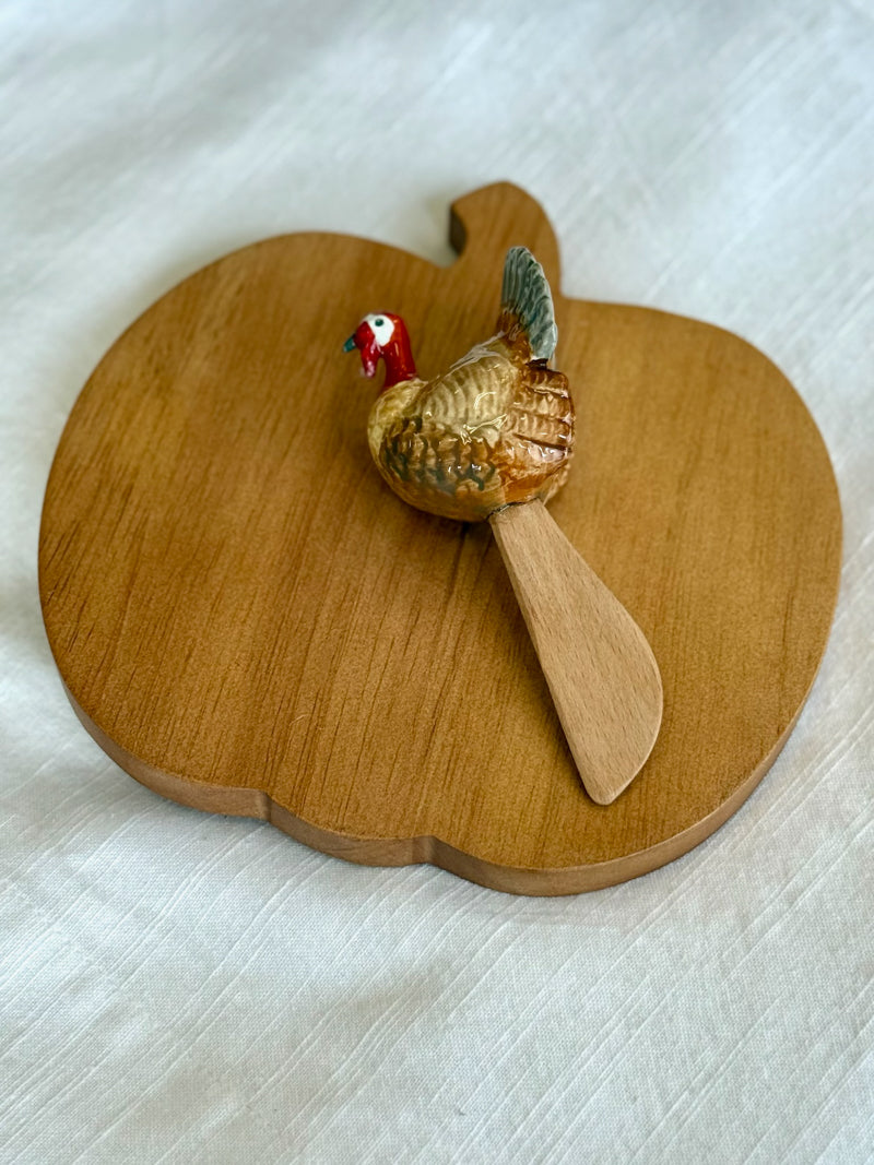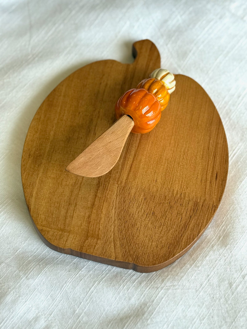 Serve up autumn charm with this pumpkin-shaped pine wood board and matching spreader, topped with a hand-painted ceramic pumpkin—perfect for festive snacks and cozy gatherings.