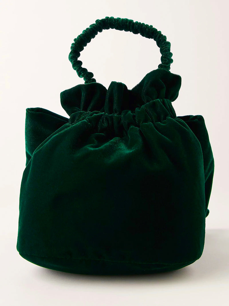 Velvet dreams meet vintage charm — this emerald-green pouch-style bag stuns with its oversized bow and plush, unstructured silhouette. Finished with a smocked elastic handle for that just-right scrunchy touch.