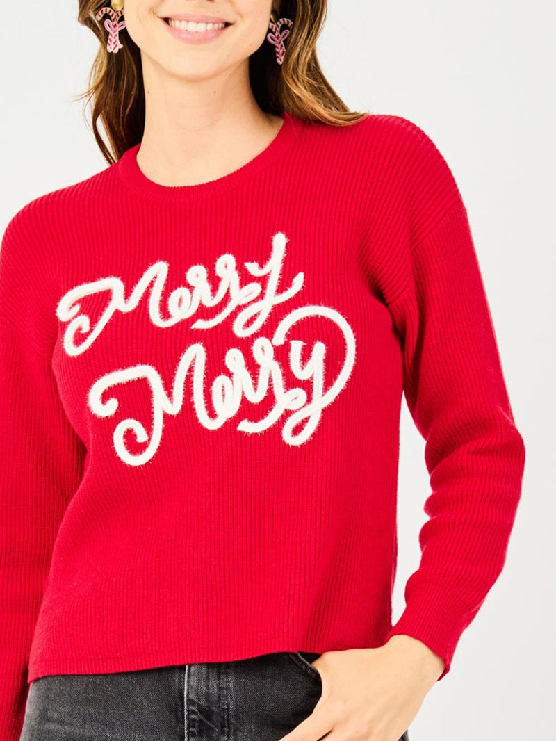Bring on the holiday cheer. This cozy red knit sweater is merry in every way! Featuring fuzzy white “merry merry” lettering, a classic crew neckline, and soft balloon sleeves with fitted cuffs for that polished, festive touch.