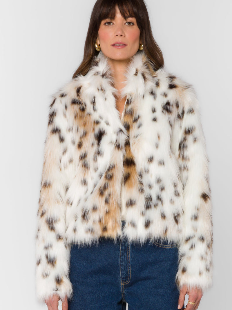 Cozy meets luxurious in this faux-fur, snow leopard animal print jacket. Crafted from ultra-soft polyester and fully lined for added comfort, it offers plush warmth without sacrificing style. The stand collar and front hook closure keeps the silhouette clean and sophisticated.