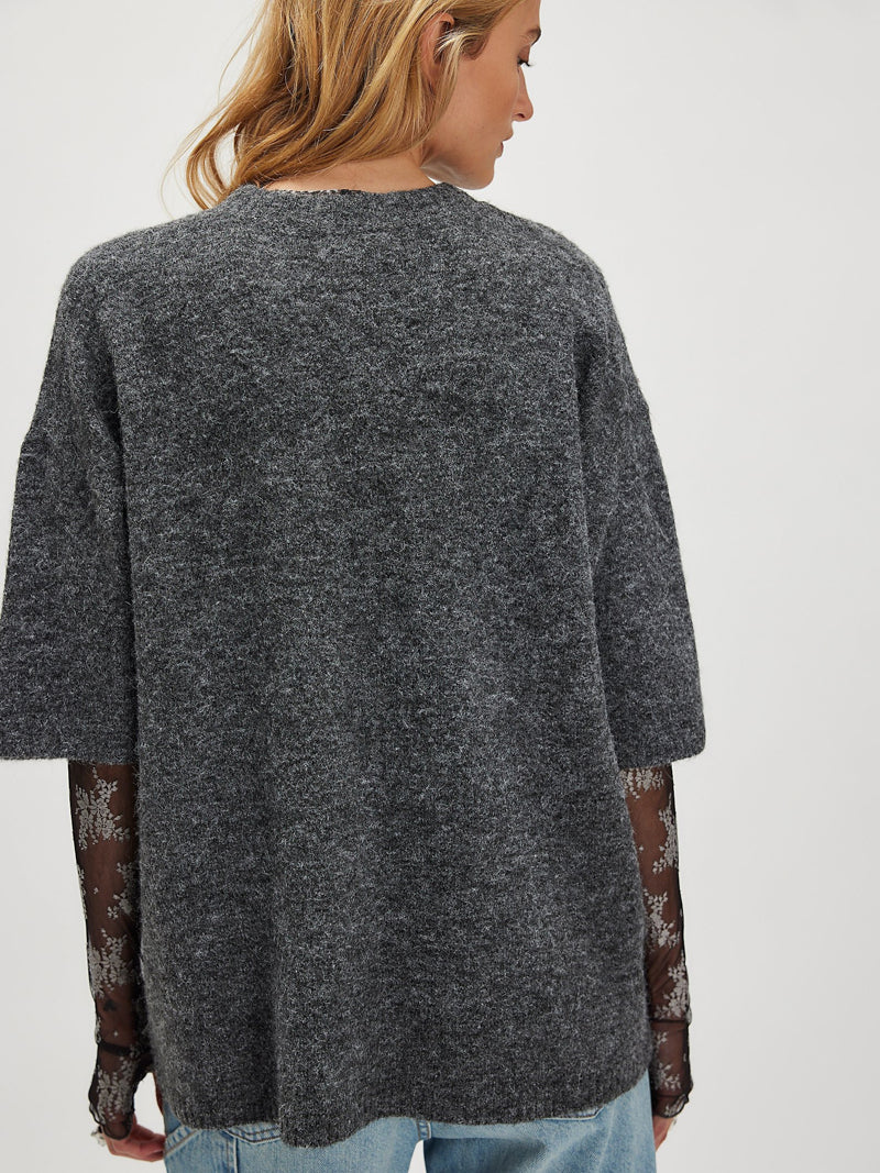 Meet your new chill-day essential — this charcoal gray melange sweater tee brings cozy meets cool. Designed in the ideal oversized fit with a crew neckline, drop shoulders, and ribbed trim, it’s your go-to for effortless, laidback styling all season long.