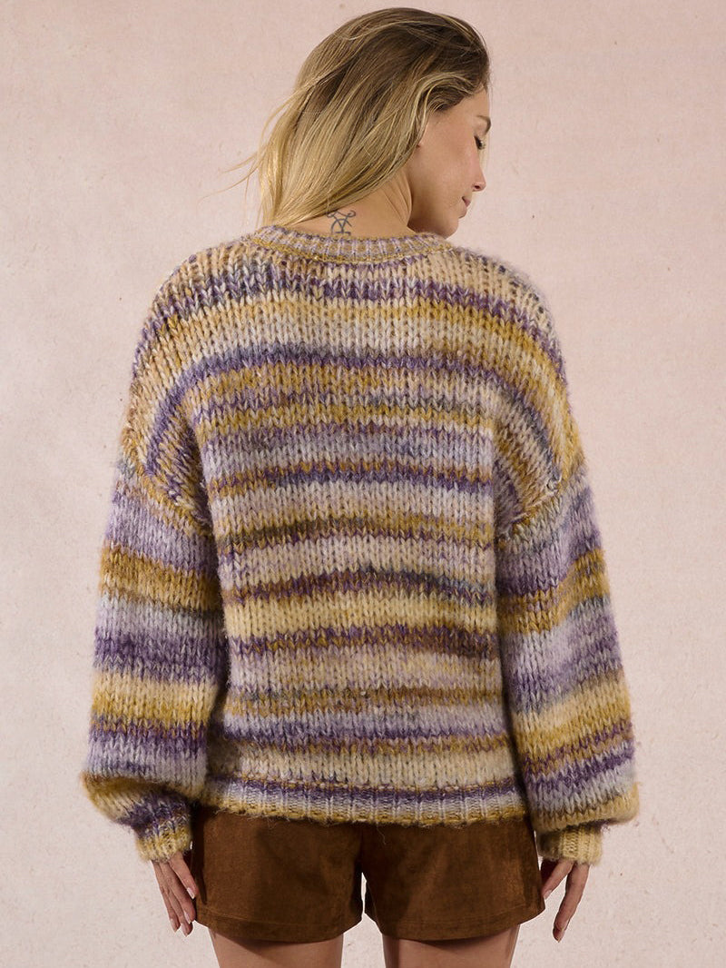 Cozy meets bold in this oversized yellow and purple striped sweater! With relaxed low armholes, long sleeves with snug cuffs, and a classic round neckline, it’s giving comfy, colorful, and totally statement-worthy vibes.