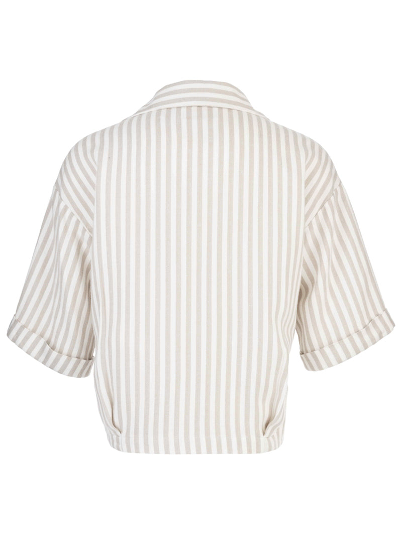 This short-sleeve collared linen shirt combines timeless polish with relaxed ease. Featuring a button-front design and soft ivory stripes, its lightweight, airy fabric makes it perfect for warm days or layered looks.