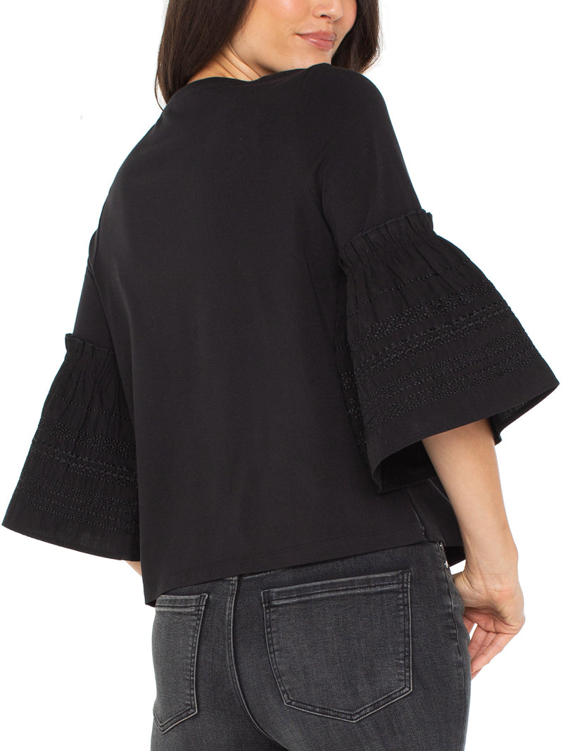 Understated yet striking, this black knit top features a graceful A-line silhouette and a classic round neckline. Embellished three-quarter bell sleeves add depth and movement, making it chic and versatile for almost any occasion.
