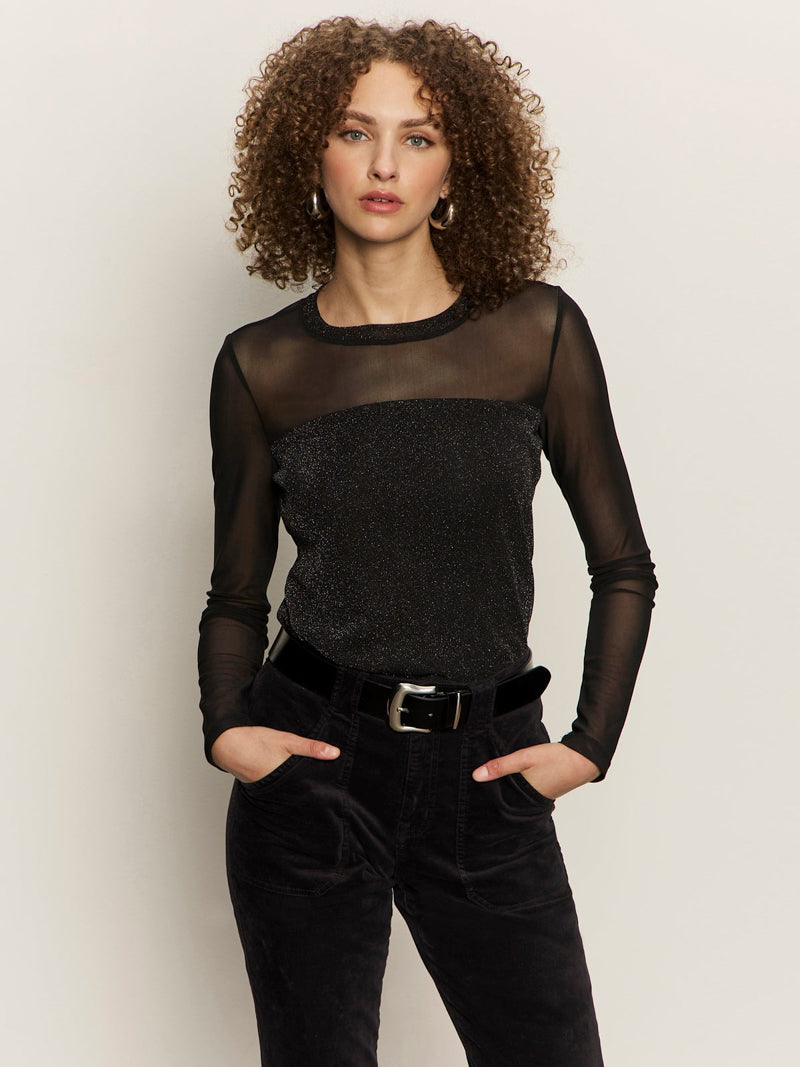 Shine with confidence in this black mesh long-sleeve top featuring a sparkling bodice that catches every eye. With its crew neck, fitted silhouette, and lightweight pull-on design, it’s the perfect mix of daring and refined—made to steal the spotlight.