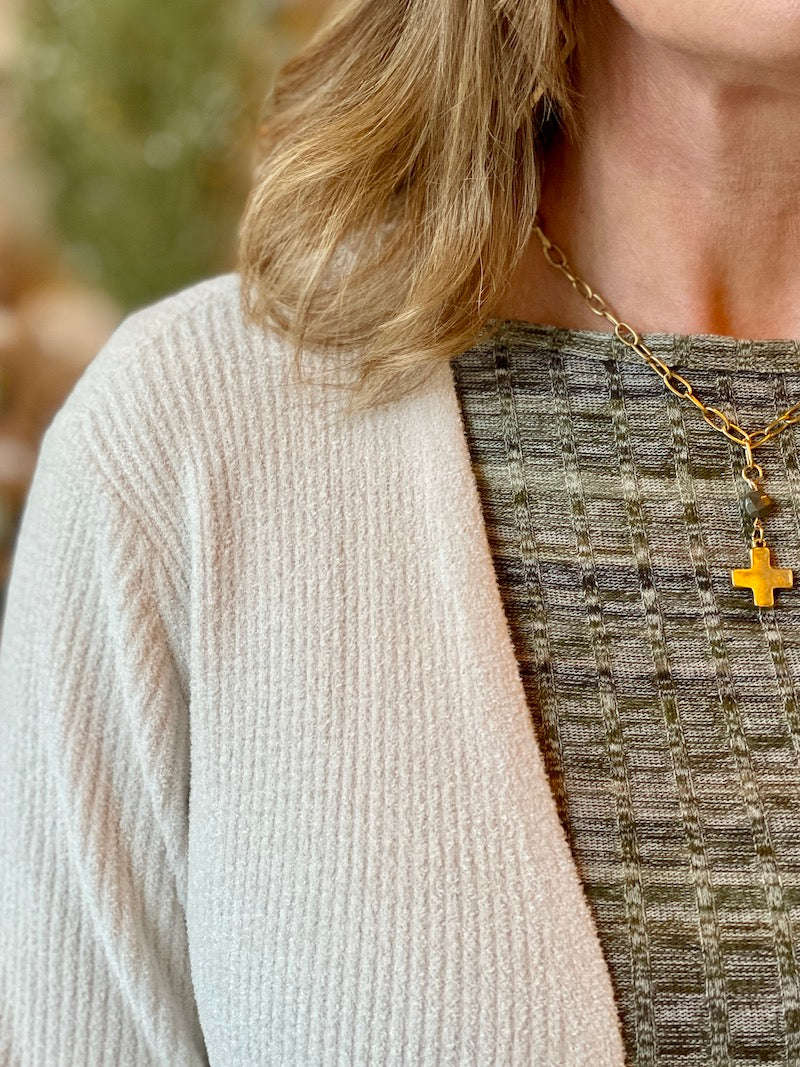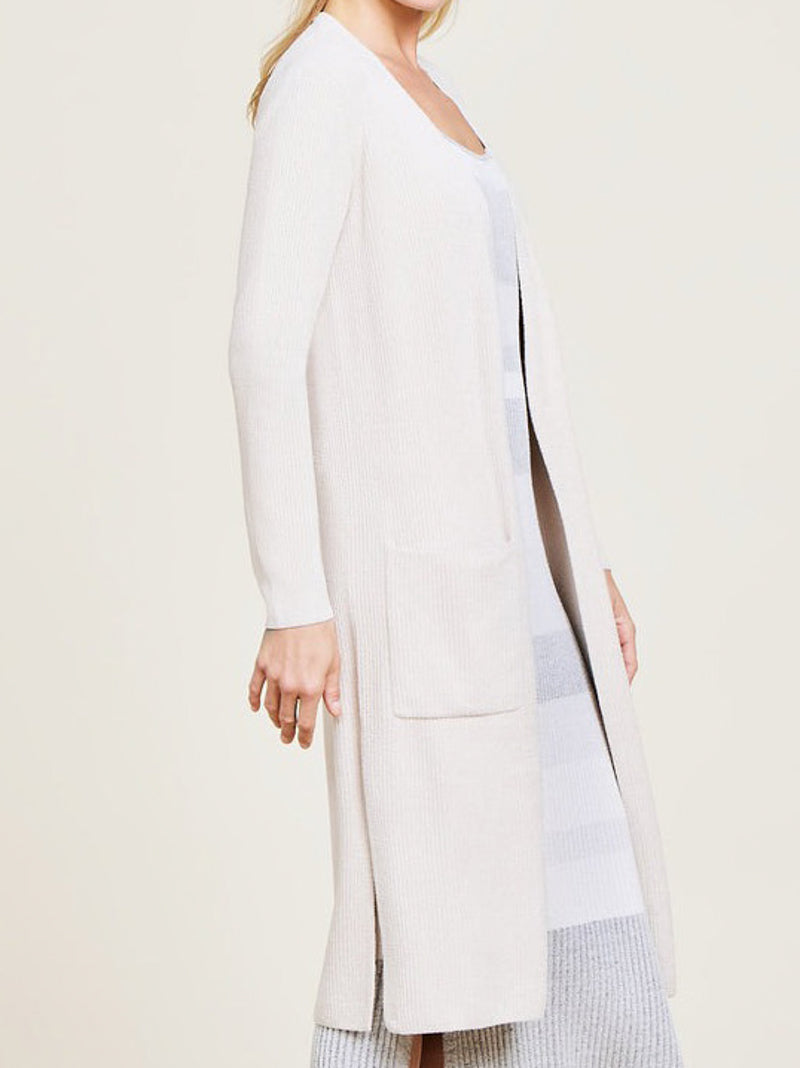 Simple but not basic, this luxuriously soft, ribbed, cream cardigan from Barefoot Dreams is a must-have for cozy and fabulous style. Two front pockets and side slits complete this open-front warm layer that will be a favorite year after year.