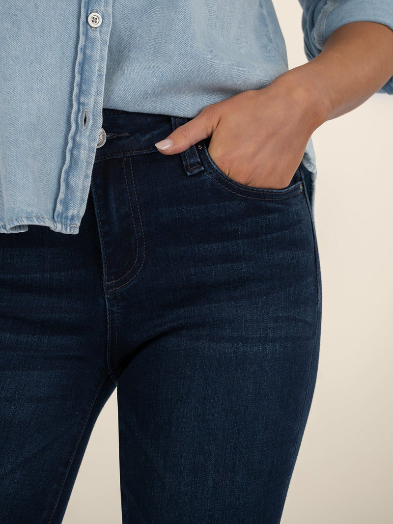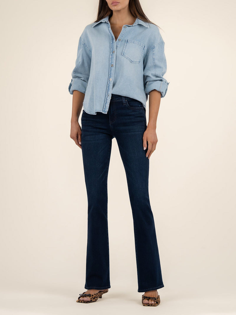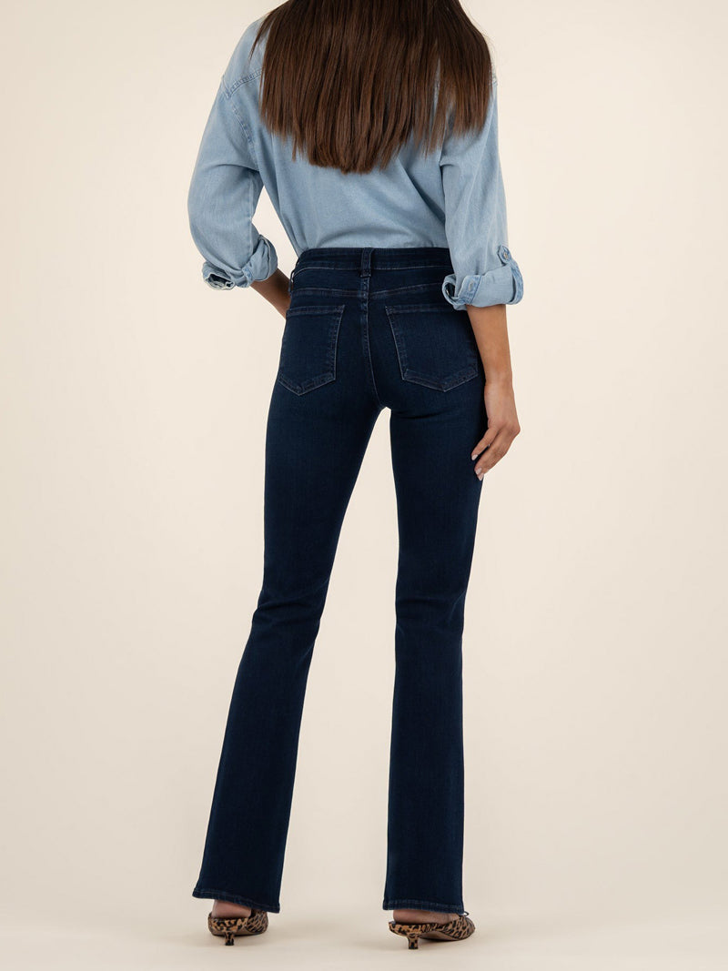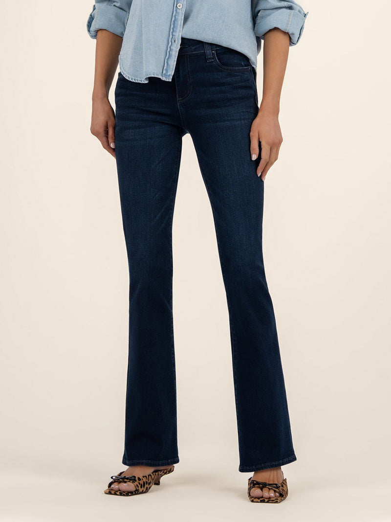 Easily transition from day to night in subtly flared bootcut jeans cut slim from soft, stretchy, deep blue denim in a mid rise fit.