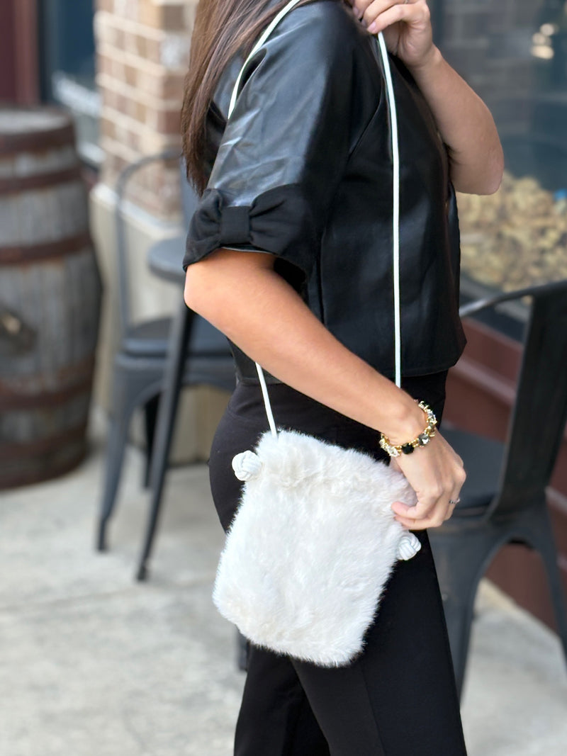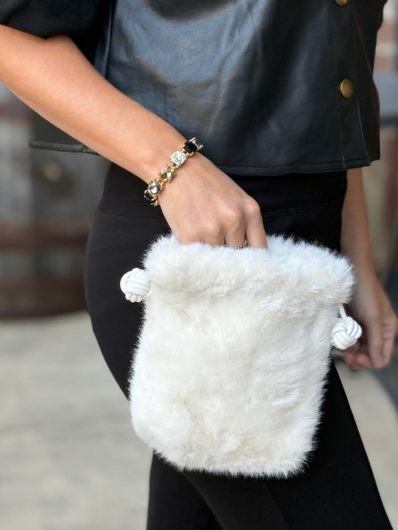 Add a touch of cozy glam to your everyday look with this chic white faux fur crossbody bag. Designed with ultra-soft faux fur for a plush texture, this small purse effortlessly combines comfort, fashion, and function. Draw cord closure.
