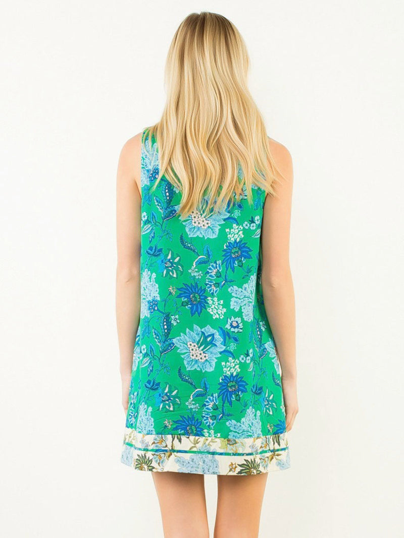 Vibrant and tropical, this sleeveless mini dress in a rich green-teal floral print is designed to turn heads. The high split neckline adds a confident edge and the contrast piping highlights the clean lines giving the dress a polished, fashion-forward finish.