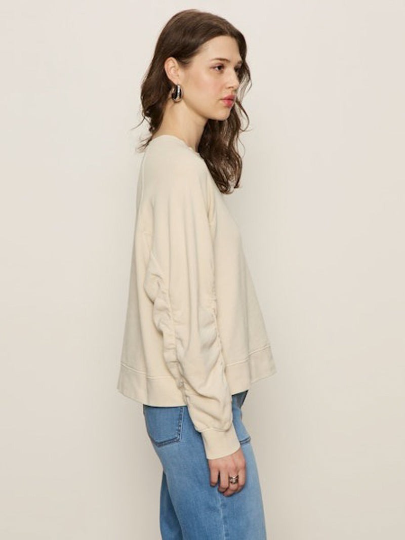 Slip into easy softness with this vanilla creme crew-neck sweatshirt. Designed for relaxed, effortless comfort, it features long shirred sleeves that add a gentle touch of texture and flow. The lightweight feel makes it perfect for layering or lounging, while ribbed cuffs bring just the right bit of structure.