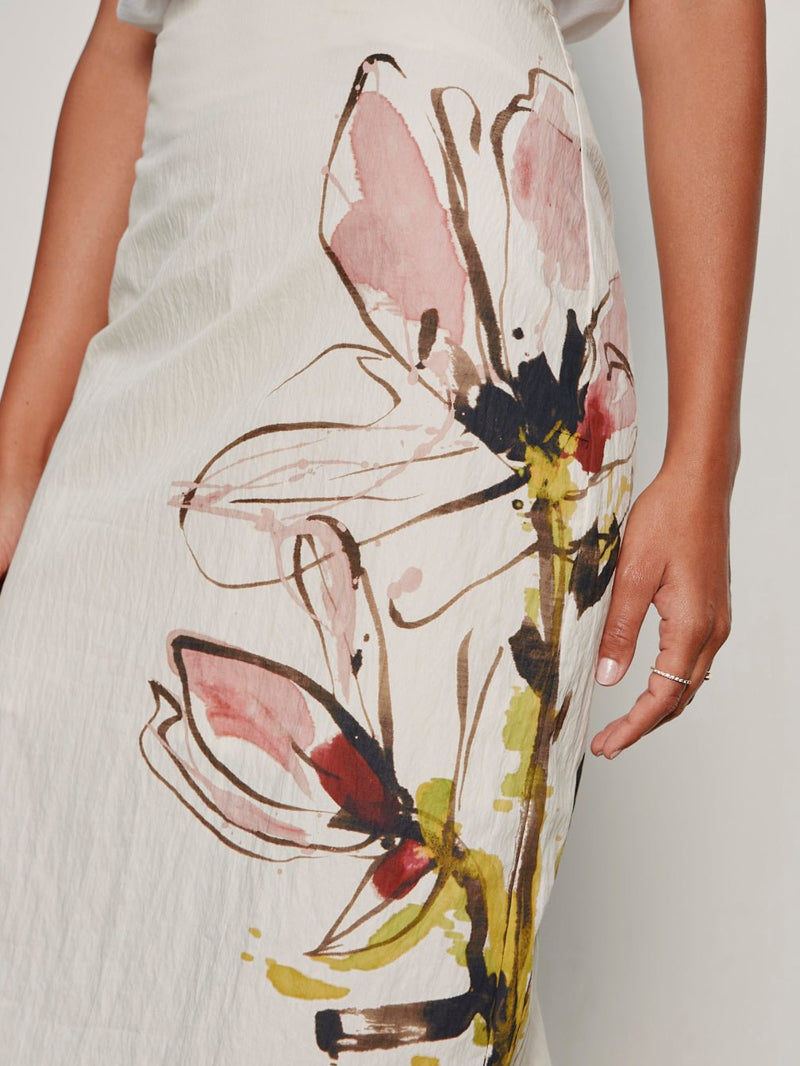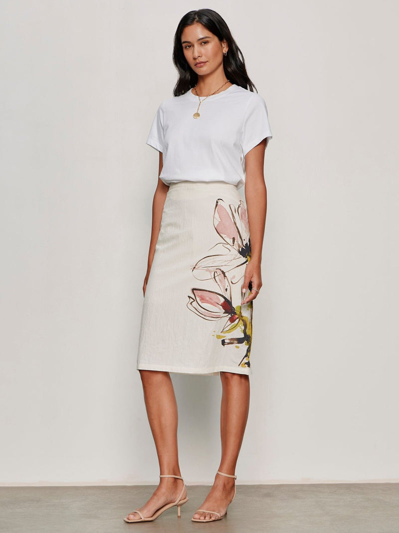 This Artist Series pencil midi skirt features a soft pink floral pattern that brings a graceful, feminine touch to a timeless silhouette. Designed with a standard rise and a semi-fitted shape, it skims the figure beautifully while remaining comfortable and lightweight.