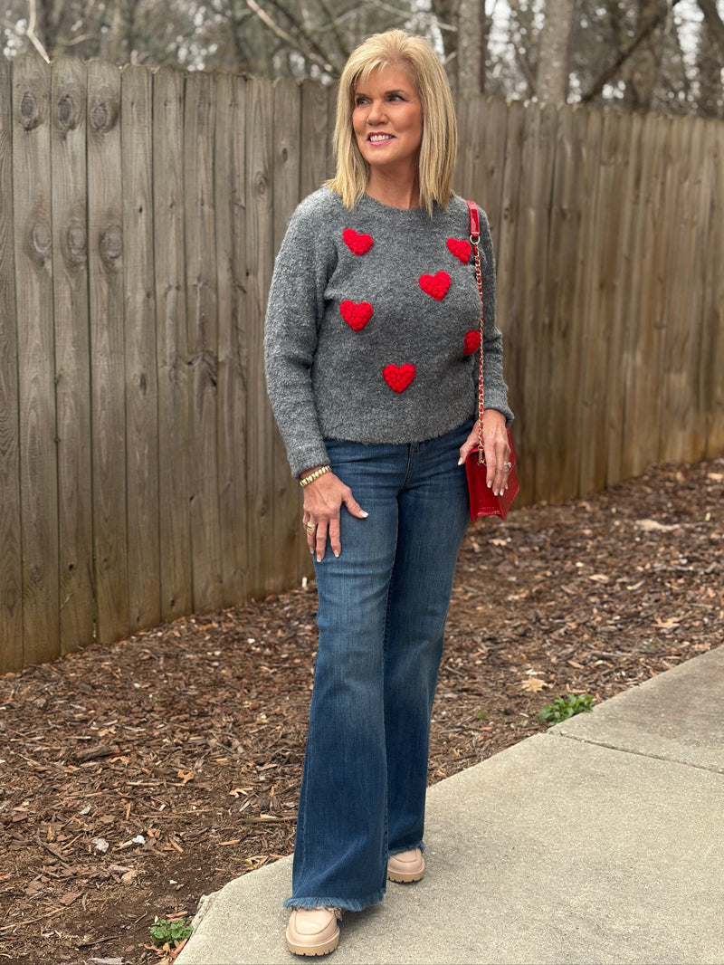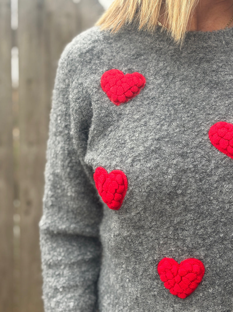 Wrapped in soft gray warmth, this cozy knitted long sleeve sweater steals the spotlight with a little wink—its pom pom red heart pattern sitting front and center like a love note you can wear. It’s the kind of piece that makes comfort feel a little bit flirtatious.