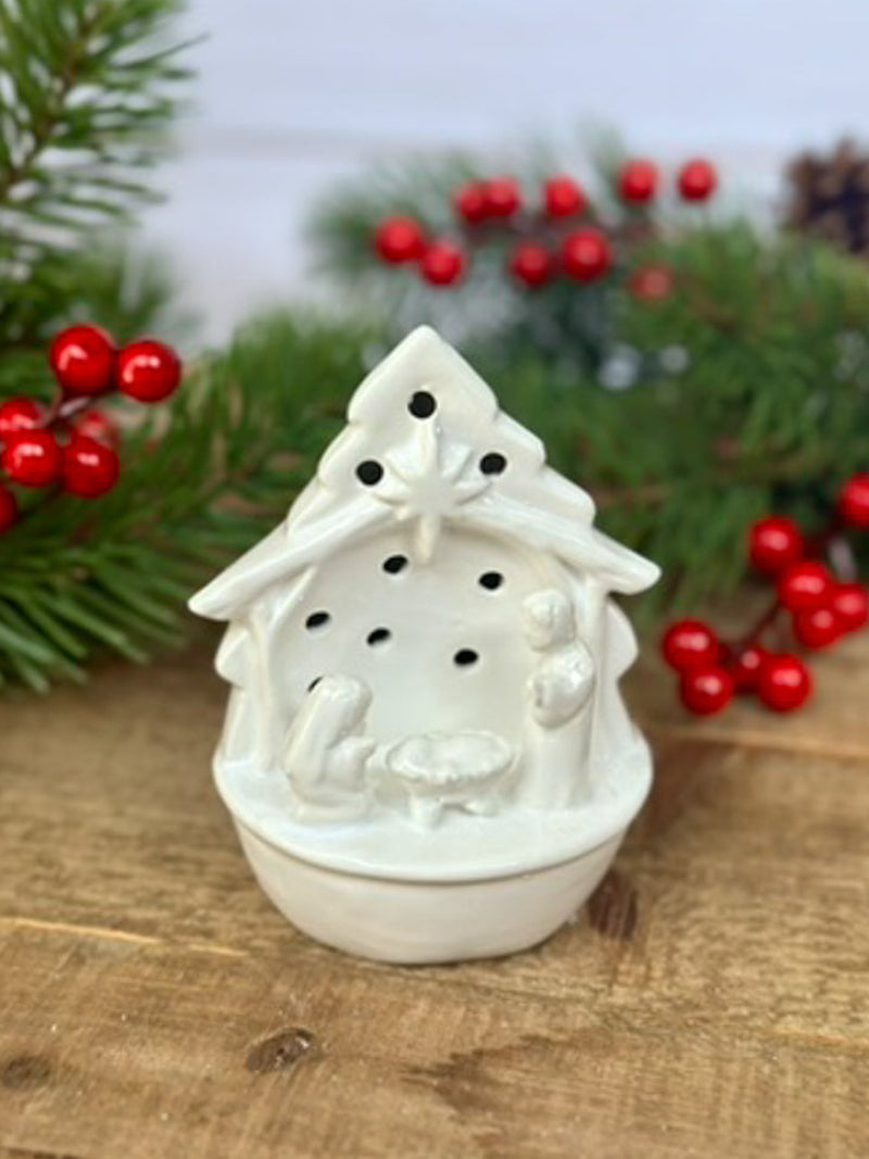 Bring the holiday spirit of the season to life with this charming white ceramic nativity light-up sitter! Intricate pierced details allow soft LED lights to shine through, creating a warm, inviting glow that adds a touch of magic to your holiday decor.
