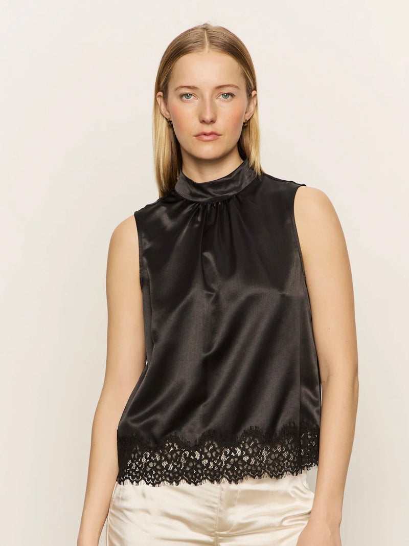 This rich black satin tank is sleek, simple, and effortlessly chic. Its mock neckline and back keyhole add subtle style, while the smooth satin and lace trim make it perfect for dressing up or layering for evening vibes.